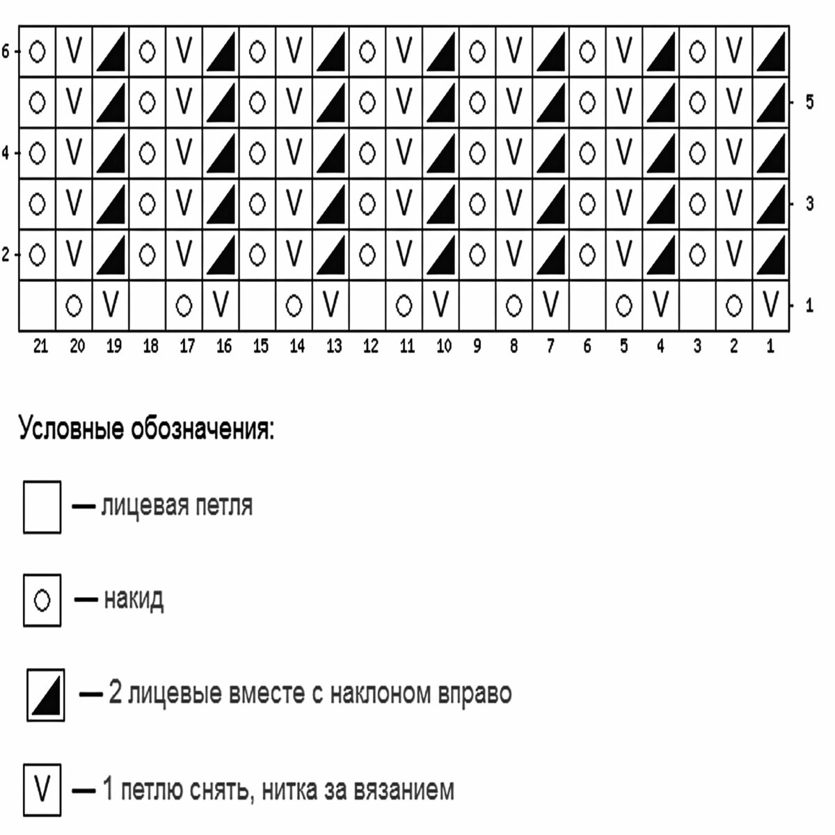 - 5-й ряд: 2 лицевых вместе, 1 изнаночная, 2 лицевых, 1 изнаночная – до конца ряда.