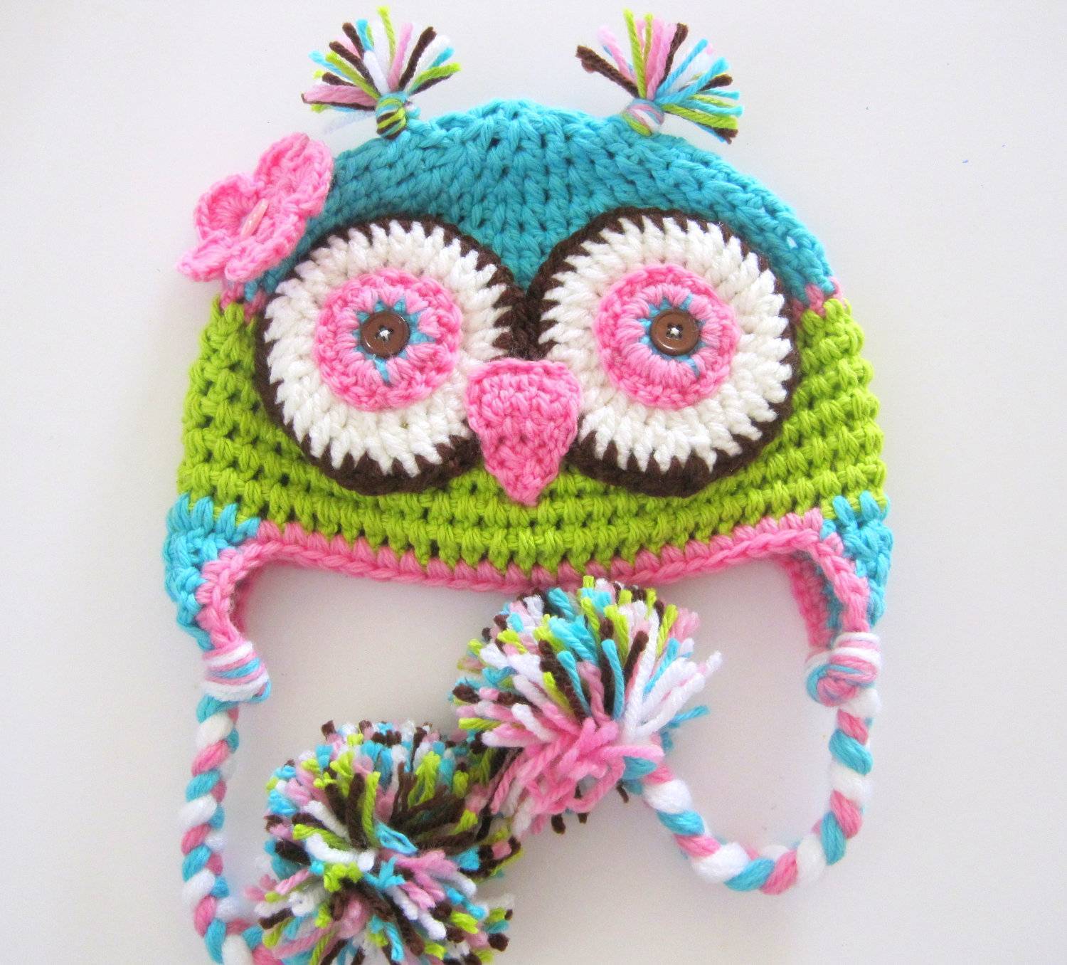 Симметрично первому ушку вяжут второе. По нижнему краю шапочку и ушки обвязывают столбиками без накида в 1 ряд. Затем делают ещё 3 ряда нитями разного цвета, как при обвязке шарфика. На макушке прикрепляют помпон из пряжи белого цвета. Завязки — 2 цепочки из воздушных петель длиной около 40 см. Над каждым ушком пришивают цветы, как на шарфе.