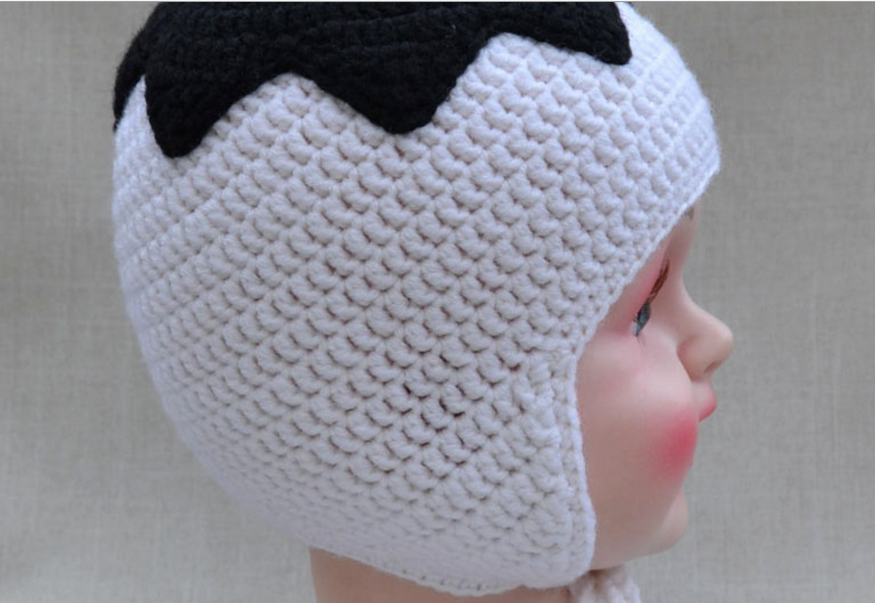 Симметрично первому ушку вяжут второе. По нижнему краю шапочку и ушки обвязывают столбиками без накида в 1 ряд. Затем делают ещё 3 ряда нитями разного цвета, как при обвязке шарфика. На макушке прикрепляют помпон из пряжи белого цвета. Завязки — 2 цепочки из воздушных петель длиной около 40 см. Над каждым ушком пришивают цветы, как на шарфе.