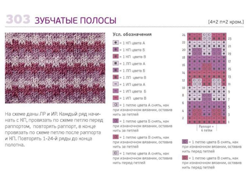1-й ряд (лицевая сторона): кром. петля, вязать лицевыми до последней петли, кром. петля.2-й ряд (изн. сторона): кром. петля, вязать изнаночными до последней петли, кром. петля.3-й ряд (лиц. сторона): кром. петля, *1 лиц., 1 изн., повторять от * до последних 2х петель, 1 лиц., кром. петля.4-й ряд (лиц. сторона): кром. петля, *1 изн., 1 лиц., повторять от * до последних 2х петель, 1 изн., кром. петля – т.е. вязать петли по узору.