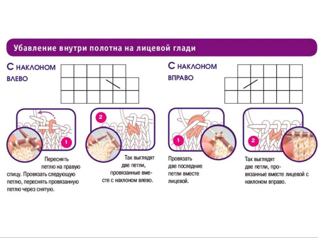 1-й ряд (изн. сторона): снять петлю, вязать изнаночными до петли убавления, 2 вместе изн., повернуть работу.2-й ряд (лиц. сторона): снять петлю, 1 лиц., 2 вместе лиц. влево, вязать лицевыми до последних 3х петель перед петлей убавления, 2 вместе лиц. вправо, 1 лиц., 2 вместе лиц., повернуть работу.3-й ряд (изн. сторона): снять работу, вязать изнаночными до петли убавления, 2 вместе изн., повернуть работу.4-й ряд (лиц. сторона): снять петлю, вязать лицевыми до петли убавления, 2 вместе лиц., повернуть работу.