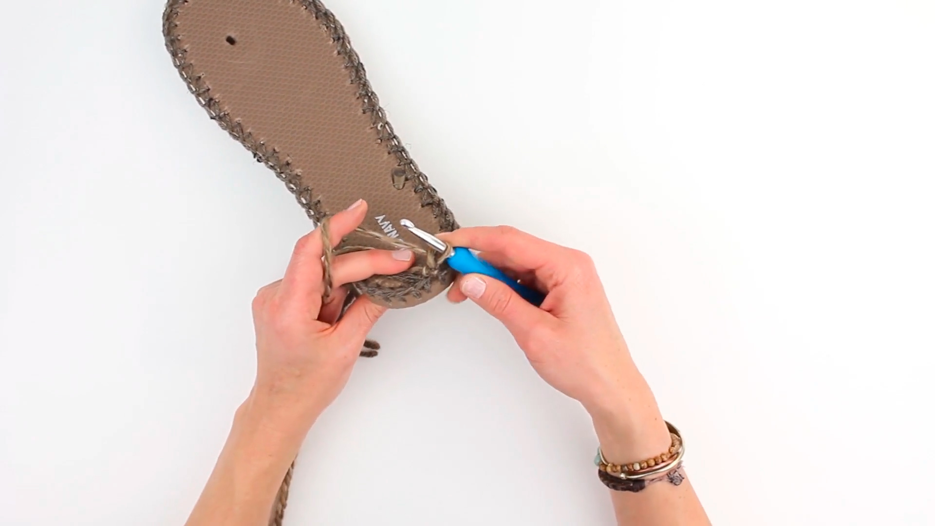 Используя самый тонкий крючок (размер 2,25 мм) провязываем ст.б/н. в каждое отверстие вокруг стопы, соединяем ряд п/ст б/н. с первым столбиком первого ряда. Обрезаем и закрепляем нить.