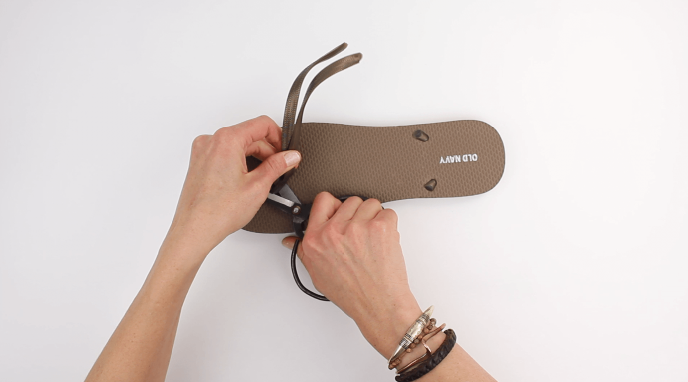 Нарисуйте на листике шаблон для пробивания отверстий в подошве: Просто проставьте отметки на расстоянии 1 см друг от друга и вырежьте полоски. Склейте полоски между собой, чтоб получилась лента и закрепите ее вокруг шлепанца. Острым инстументом проткните отверстия в каждой точке линейки. Если вы не используете шаблон, можно делать отверстия на глаз, и просто проделайте отверстия на нужном расстоянии друг от друга.