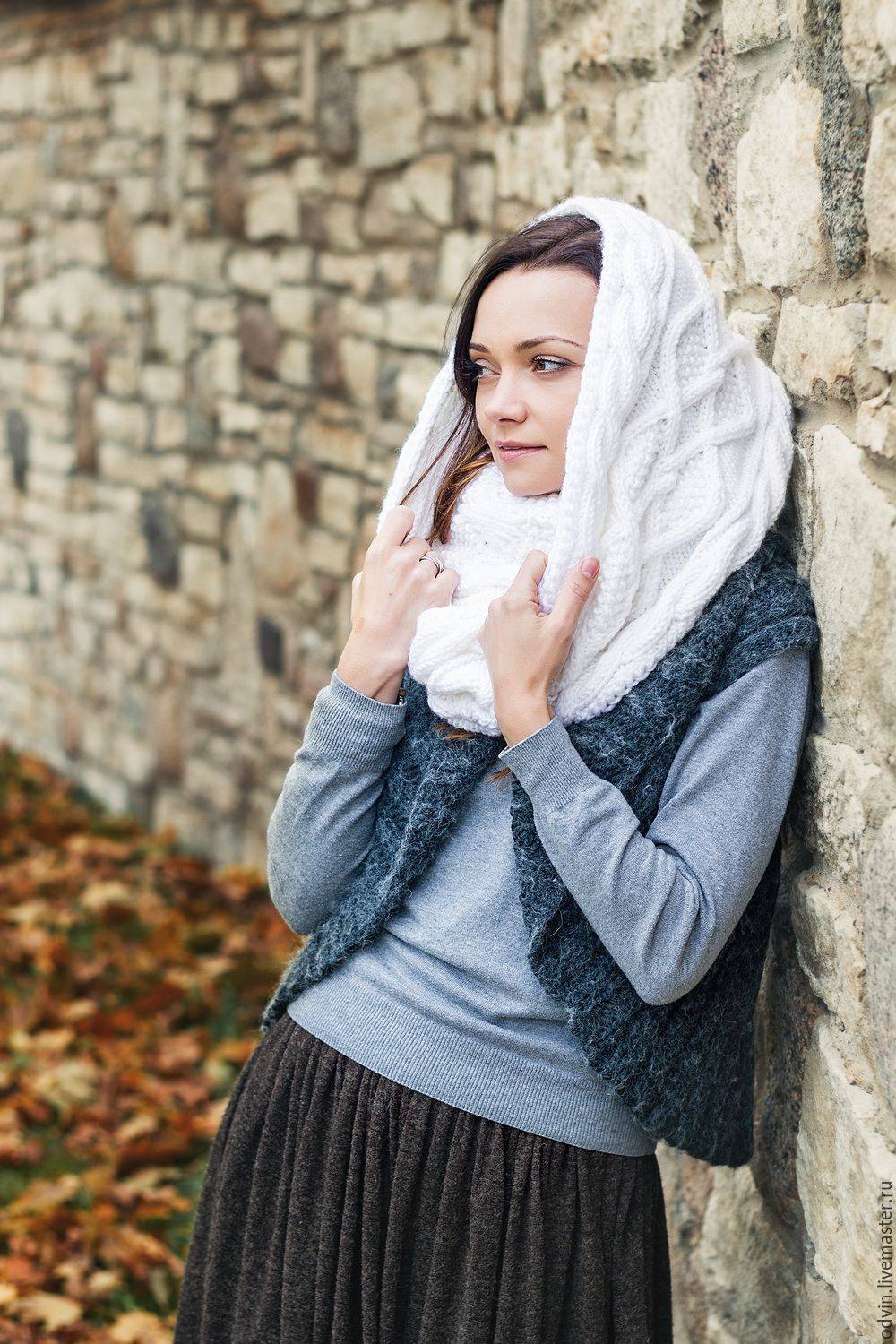 Шарф-капюшон уникален тем, что он выполняет разные функции. Он защищает от ветра и холода, не портит прическу, сберегает макияж при дожде, снегопаде. Такой шарф любой наряд сделает стильным.