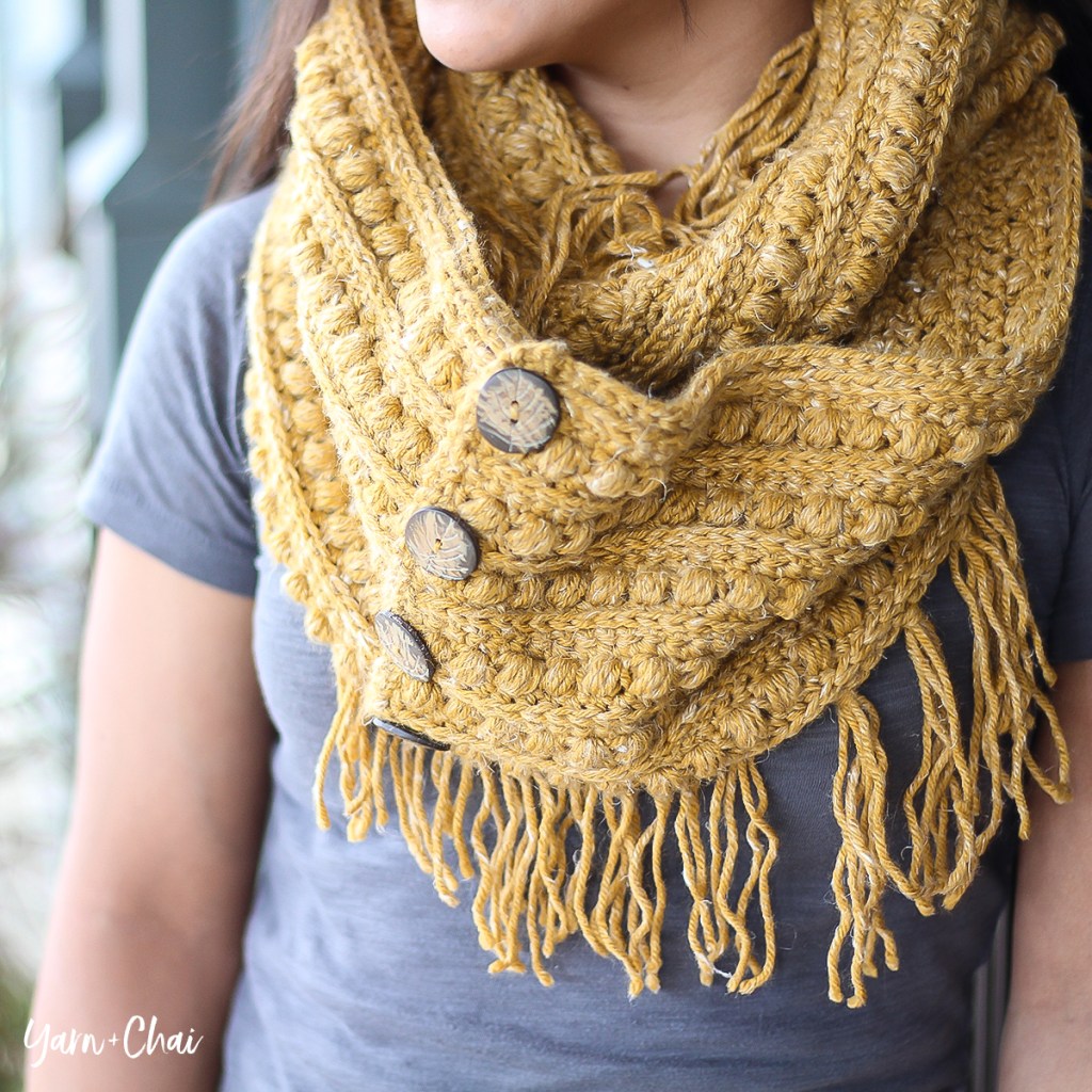 Пшеничный снуд связанный крючком с бахромой и пуговицами