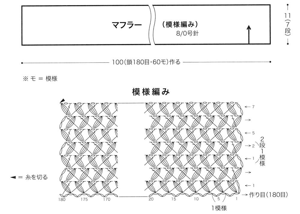 Описание последовательности вязания. Выполнить цепочку из 37 в.п. и далее вязать по схеме. Ряды 1-8 повторить 14 раз. Далее повторить ряды 1-4 один раз. Вязание закончить. Оформите края шарфа бахромой.