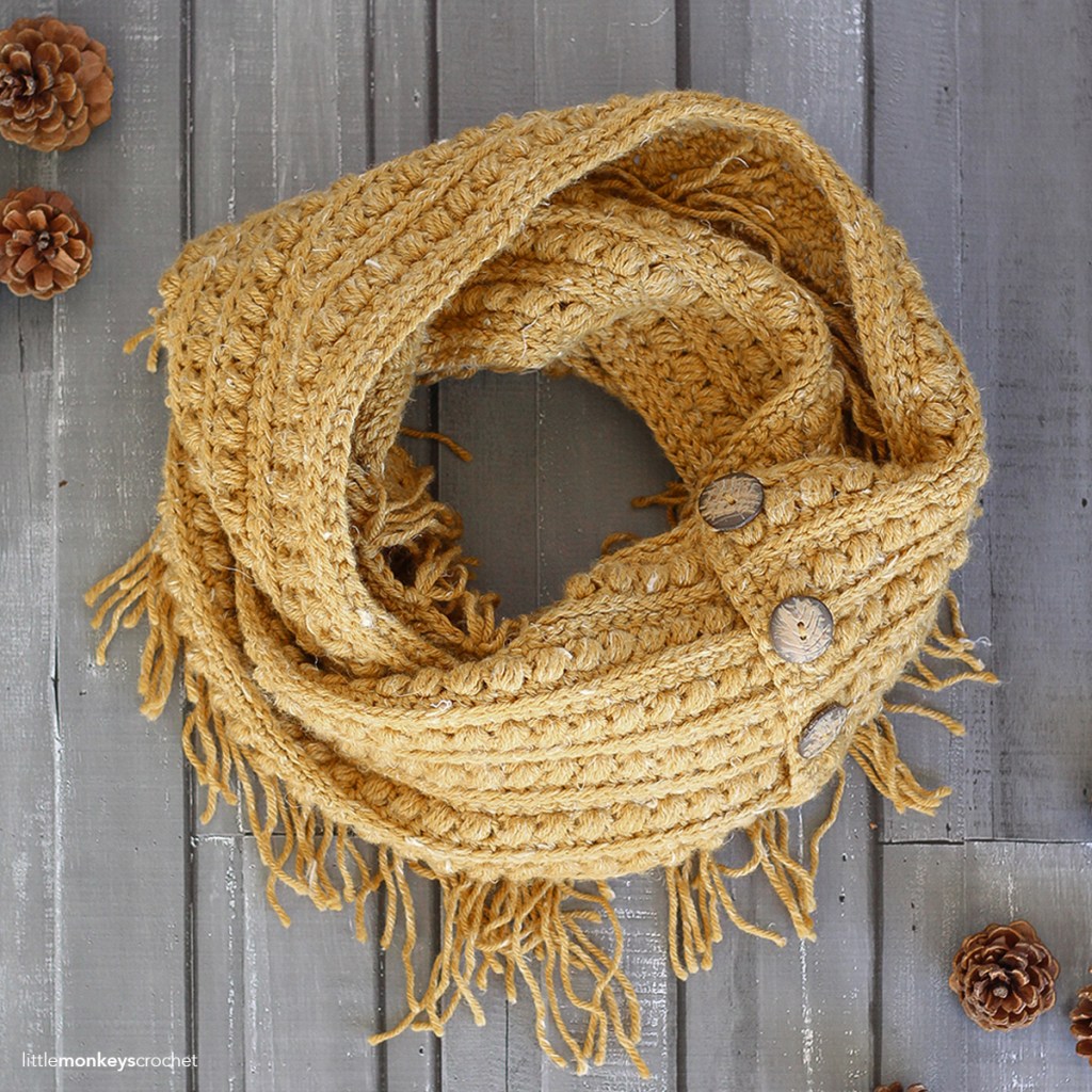 Пшеничный снуд связанный крючком с бахромой и пуговицами