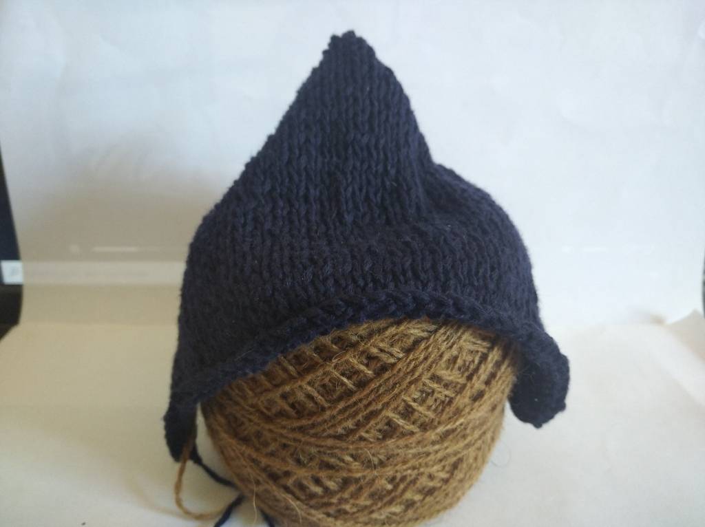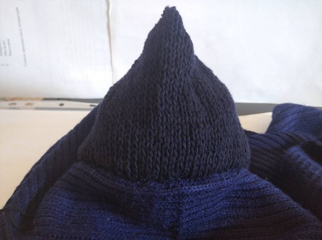 - Собираем элементы головного убора. Отмечаем на деталях середину, совмещаем отметки и связываем крючком. Шар-капюшон готов.