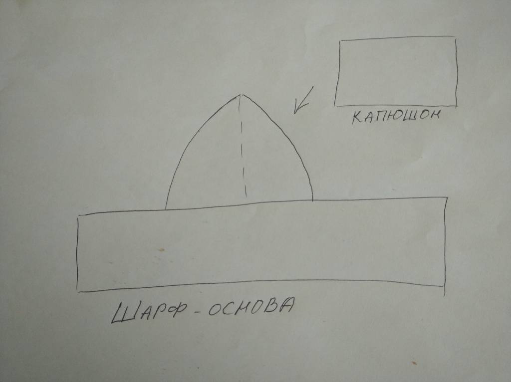 Перед тем как завязать первый узел, необходимо осуществить выкройку шарфа капюшона. Если вы опытная рукодельница, то данный этап вы можете пропустить.