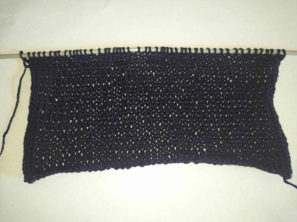 Описание работы. Подготовить 56 петель и провязать жемчужным рисунком около 20 сантиметров (вяжется так: одна лицевая петелька, одна изнаночная до окончания рядка, в последующем рядке сместить узор на один элемент).