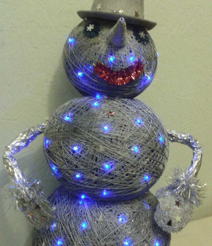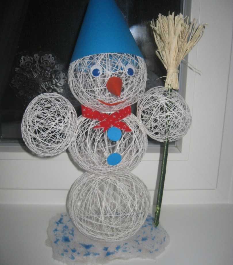 С ребёнком можно изготовить весёлый новогодний декор – например, снеговичка. Достаточно сделать два или три нитяных шара разных размеров и соединить их. Шары нужно декорировать глазками (можно взять глаза для игрушек), носиком-морковкой (конусом из оранжевого картона), место стыка шаров украсить шарфом. На голову можно поместить ведёрко, шляпу, шапку и т.д.