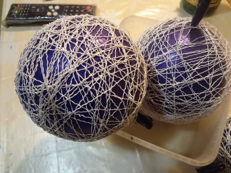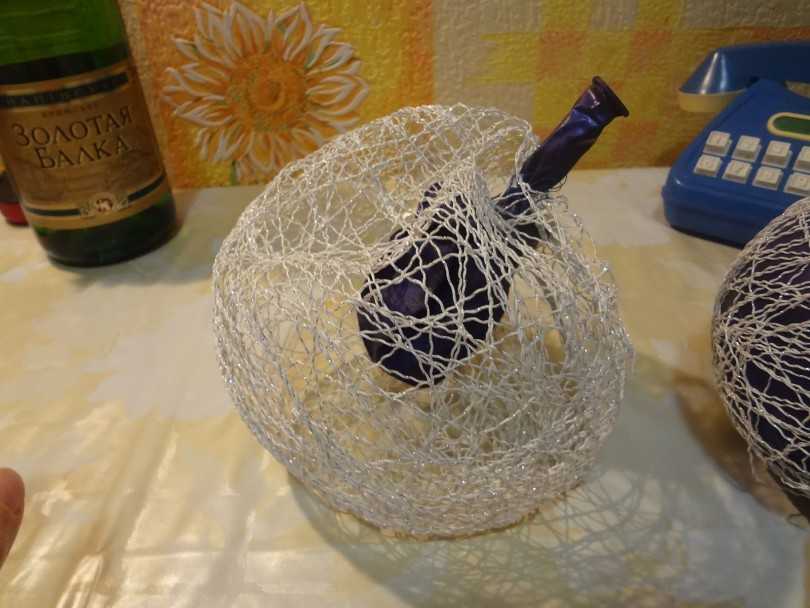 Шар несильно надувают, обмазывают его большим количеством клея, на клей наматывают нитки.