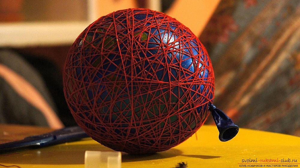 Сначала необходимо надуть и крепко завязать воздушный шарик. Затем его поверхность обильно смазывается клеем, после чего шар обматывается нитками. Главное, чтобы в конце не осталось больших прогалин на поверхности.