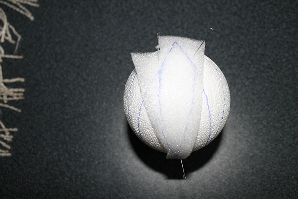 Пенопластовую поверхность смазываем клеем, далее прикладываем ткань, оставляя одинаковые припуски. Используя шпажки, заправляем края ткани в прорези игрушки. Начинать следует от середины параллельно с двух сторон, продвигаясь к краям. Лишнюю ткань обрезаем, остальное заправляем.