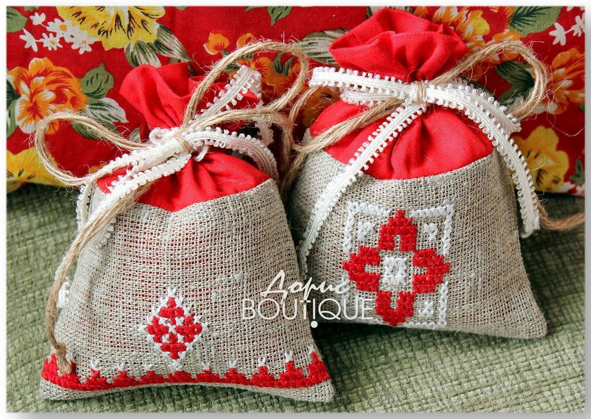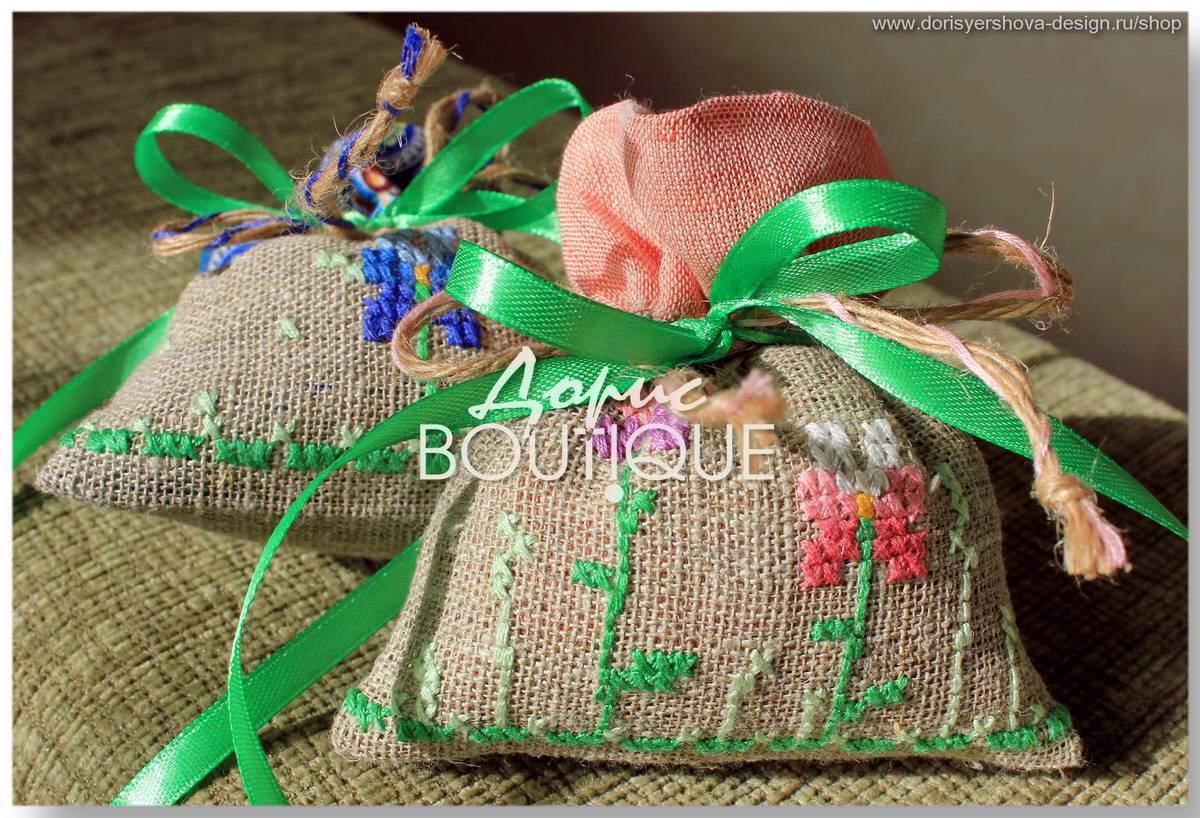 Еще один практичный вариант саше – когда в качестве материала используют канву для вышивки крестиком. У этого материала есть несколько вариантов частоты клетки, и подобрать нужный не составит труда. Мешочек можно украсить славянской вышивкой – или просто любой вышивкой на ваш вкус. Если вышивка – это не то, чем вы готовы заниматься в свой выходной, даже просто атласная лента украсит ароматический мешочек.