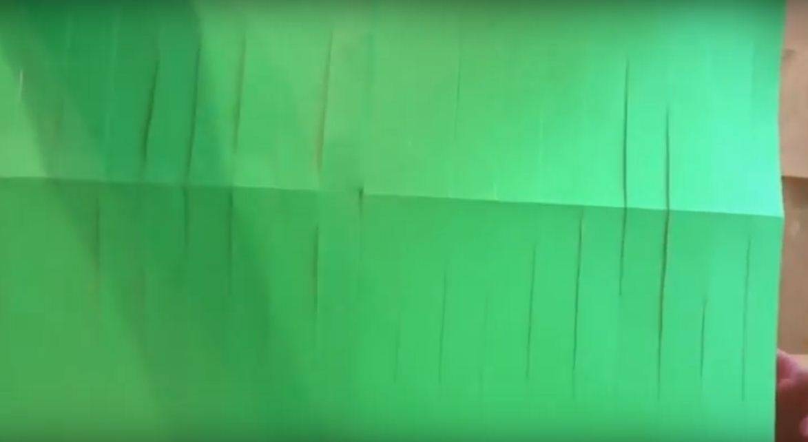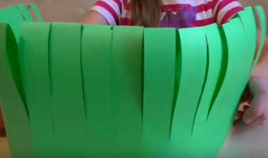 Один из неразрезанных краев смазываем клеем. И присоединяем к ней вторую сторону. В итоге, у нас получается зеленая травка. Как мы уже помним, карандашные пометки остались внутри.