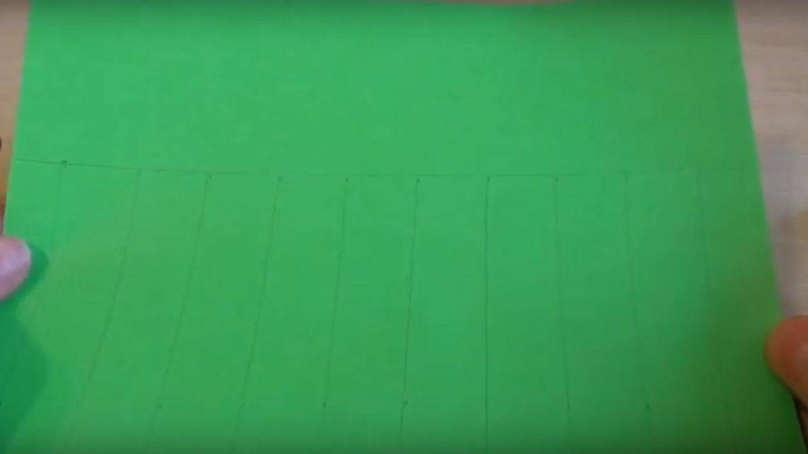 Сначала изготовим основу. Сворачиваем зеленый лист бумаги пополам. От противоположного края сгиба бумаги отмеряем 6 см. и проводим линию.