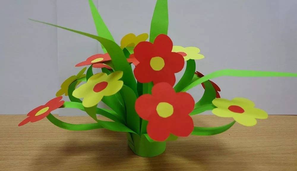 Очень легкий в исполнении букетик цветов. Такой яркий подарок понравится мастерить маленьким деткам.