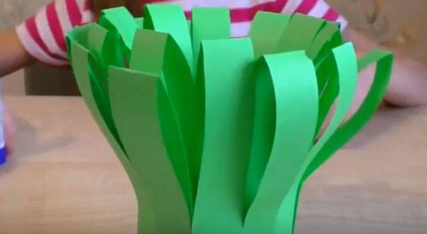 Скручиваем бумажную траву в виде небольшой клумбы. Внешний край приклеиваем, чтобы конструкция не развернулась обратно. Теперь расправляем ее и делаем более пышной.