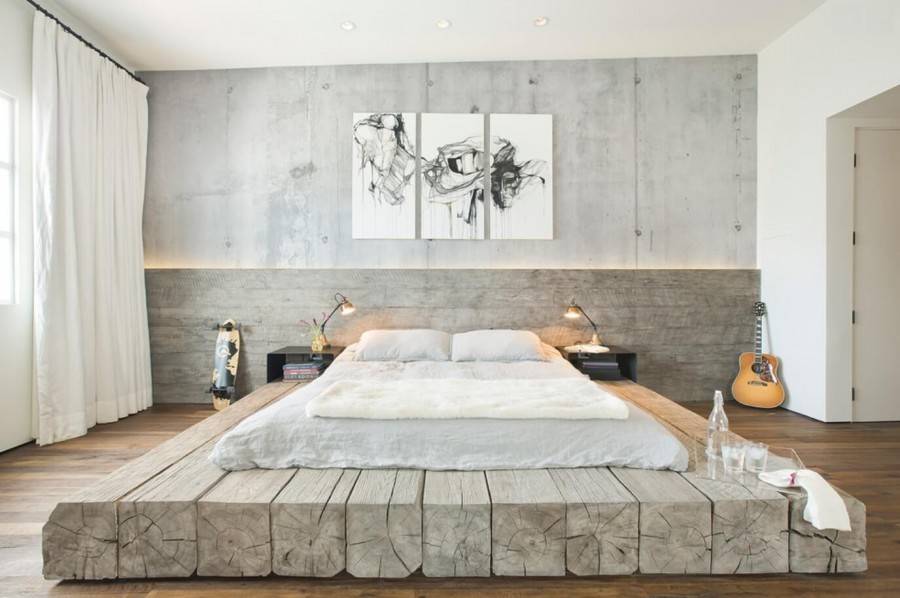 - Стену можно декорировать длинными сухими ветками в напольных вазах. Стильно смотрятся веточки, покрашенные в контрастные цвета – чёрный или белый, под золото или серебро, установленные на столик или тумбочку у кровати.