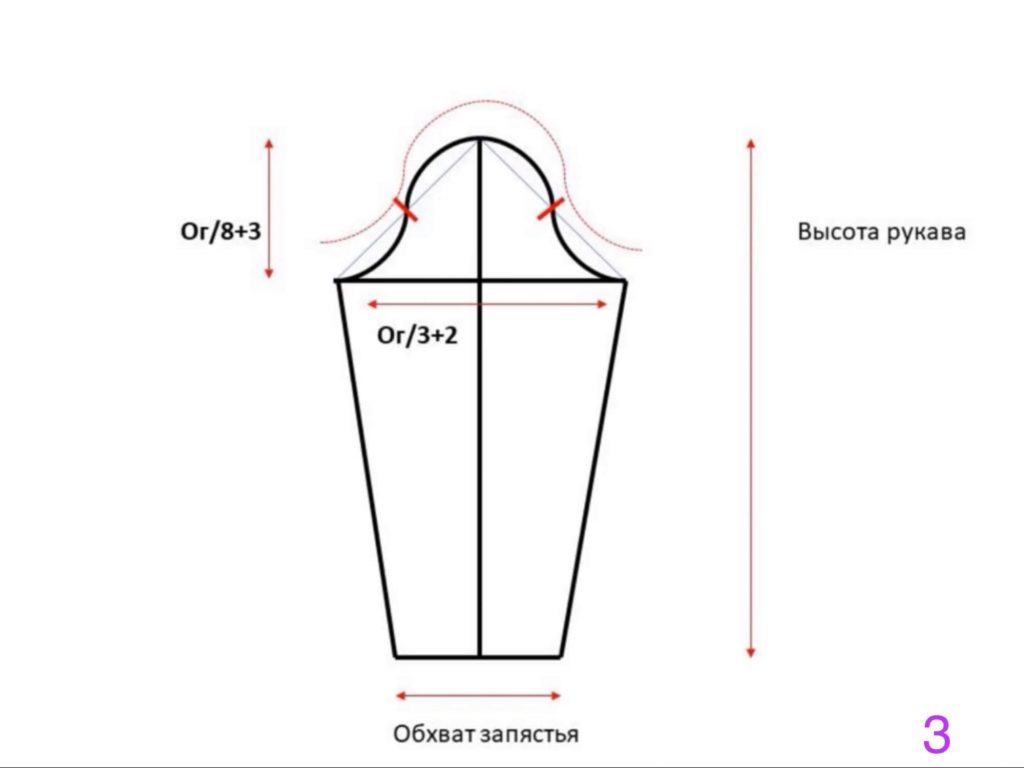 Вертикальная линия – высота рукава. Из верхней точки опускаем перпендикуляр = Огр /8 + 3. Это высота оката рукава. На этом уровне рисуем линию = Огр /3 + 2. Это ширина рукава. Внизу – Обхват запястья. Соединяем наши точки, как на схеме. Синими линиями делим эти линии попалам и прорисовываем красивый окат рукава. Помните, что длина оката рукава должна быть на 1 см. больше длины проймы переда и спинки вместе взятых.