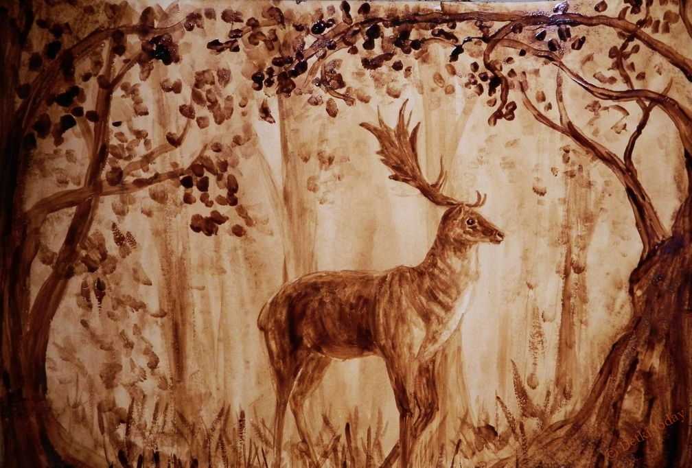 - Коричневой краской красим оленёнка. Рисуем ему рога этим же цветом. Разбавляем туловище более светлым оттенком коричневого цвета. Изображаем глазки.