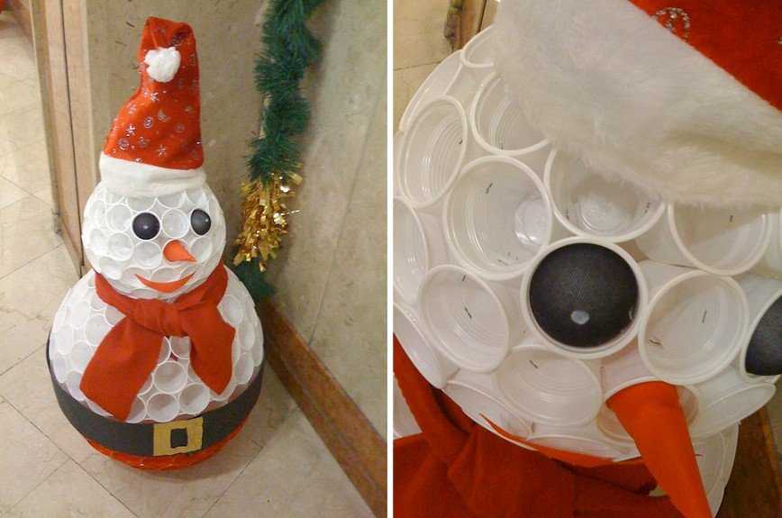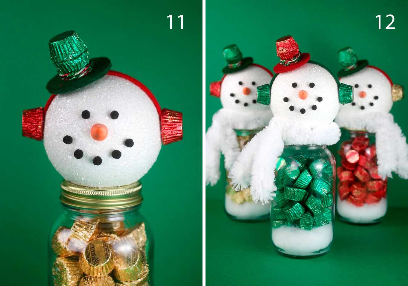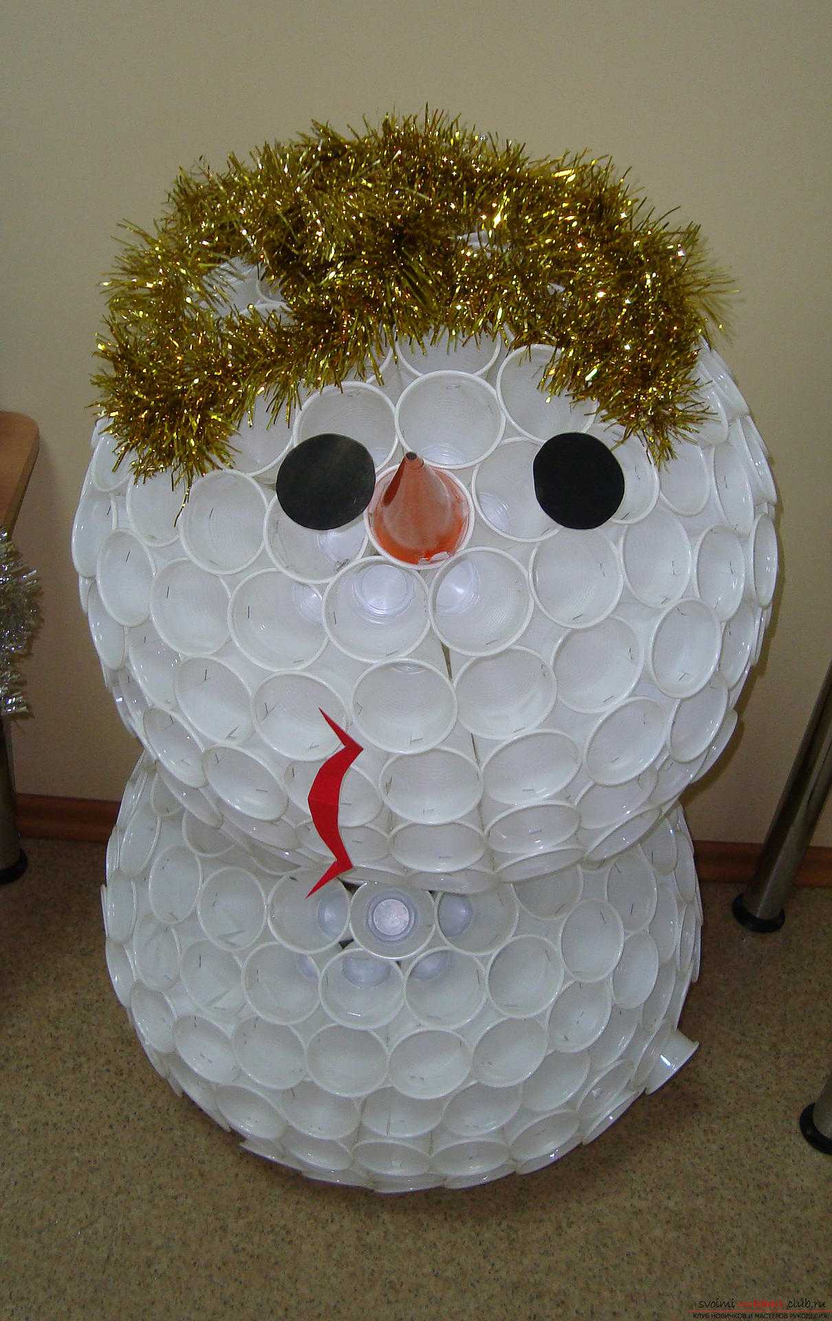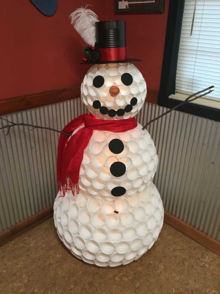 Когда лицо готово, вяжут разноцветные шапочки и шарфики и наряжают снеговика.