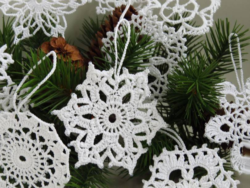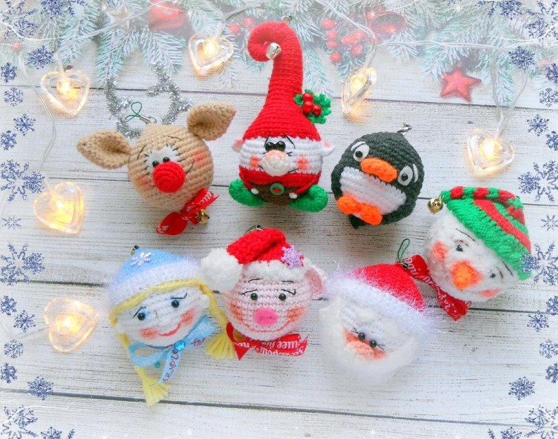 Снеговик – еще один обязательный участник новогодних праздников. Принцип изготовления вязаного снеговика: связать два или три гладких шара, сшить их вместе, пришить или приклеить глаза и нос.