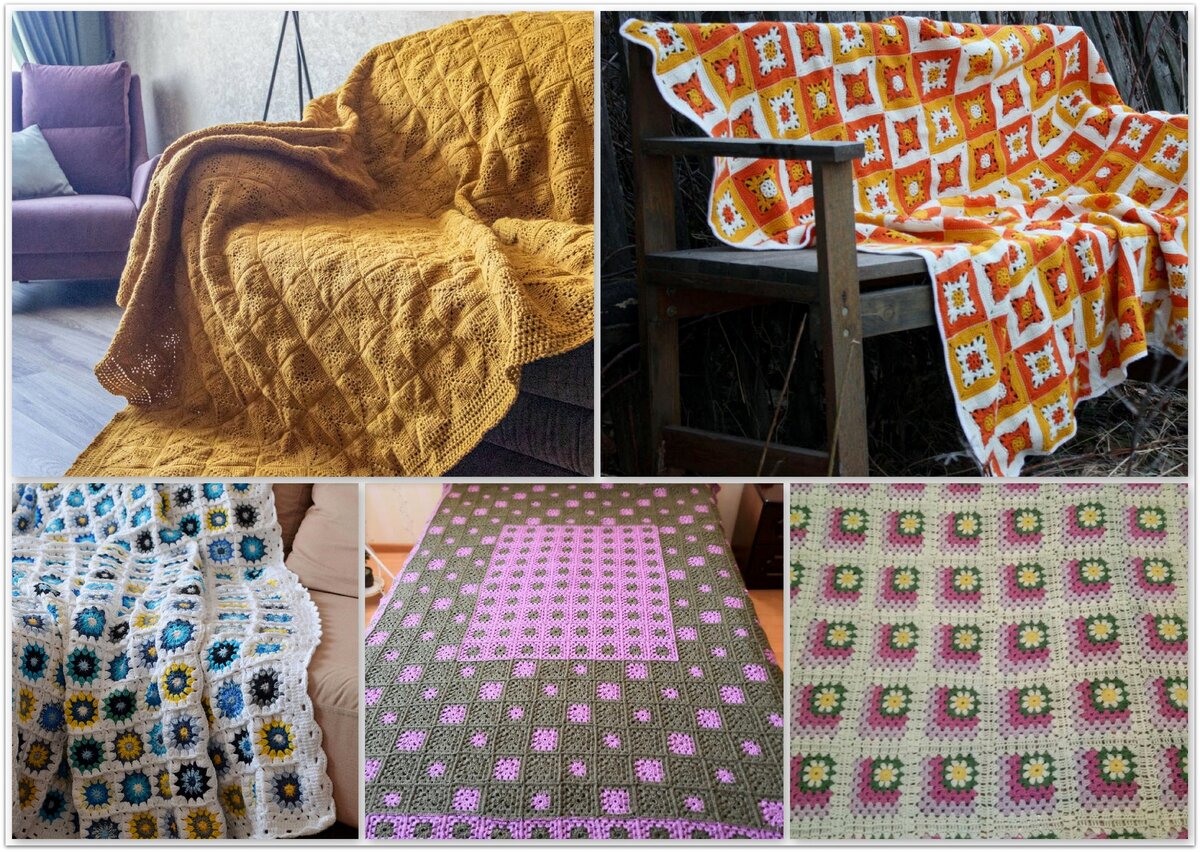 Авторы слева направо: яркий и весёлый плед «Метелица» — Наталья Косточкина; стильный плед в серо-бежевой гамме с оригинальной отделкой тамбурным швом цвета хаки — Varyavyazhet; многообразие сочных, но не кричащих цветов в пледе «Пэчворк» — Crucian Pottery; молочно-шоколадный плед — bgatovae; жёлто-зелёный плед с фиолетовыми вкраплениями — автор неизвестен.