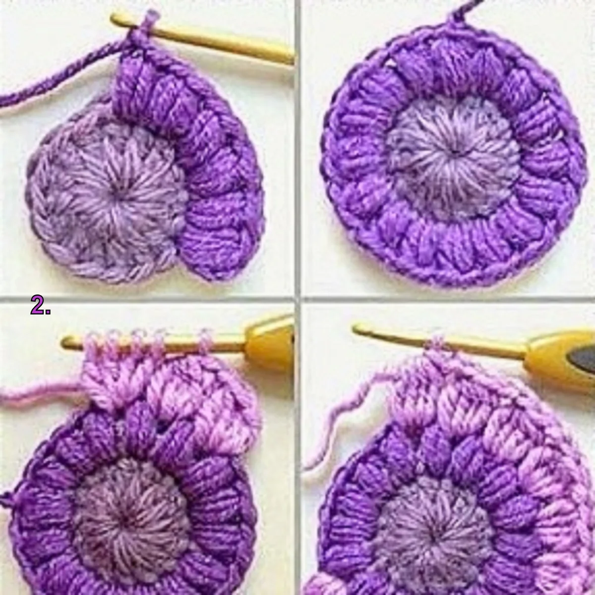 - ➋ Закончив вязать по кругу пышными столбиками, присоединяем новую ниточку, делаем несколько воздушных петель для подъёма, и теперь в промежутки между пышными столбиками вывязываем по 4 столбика с накидом.