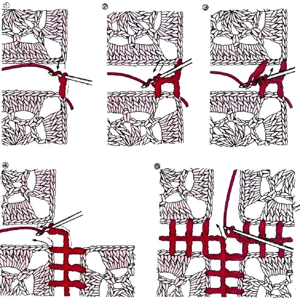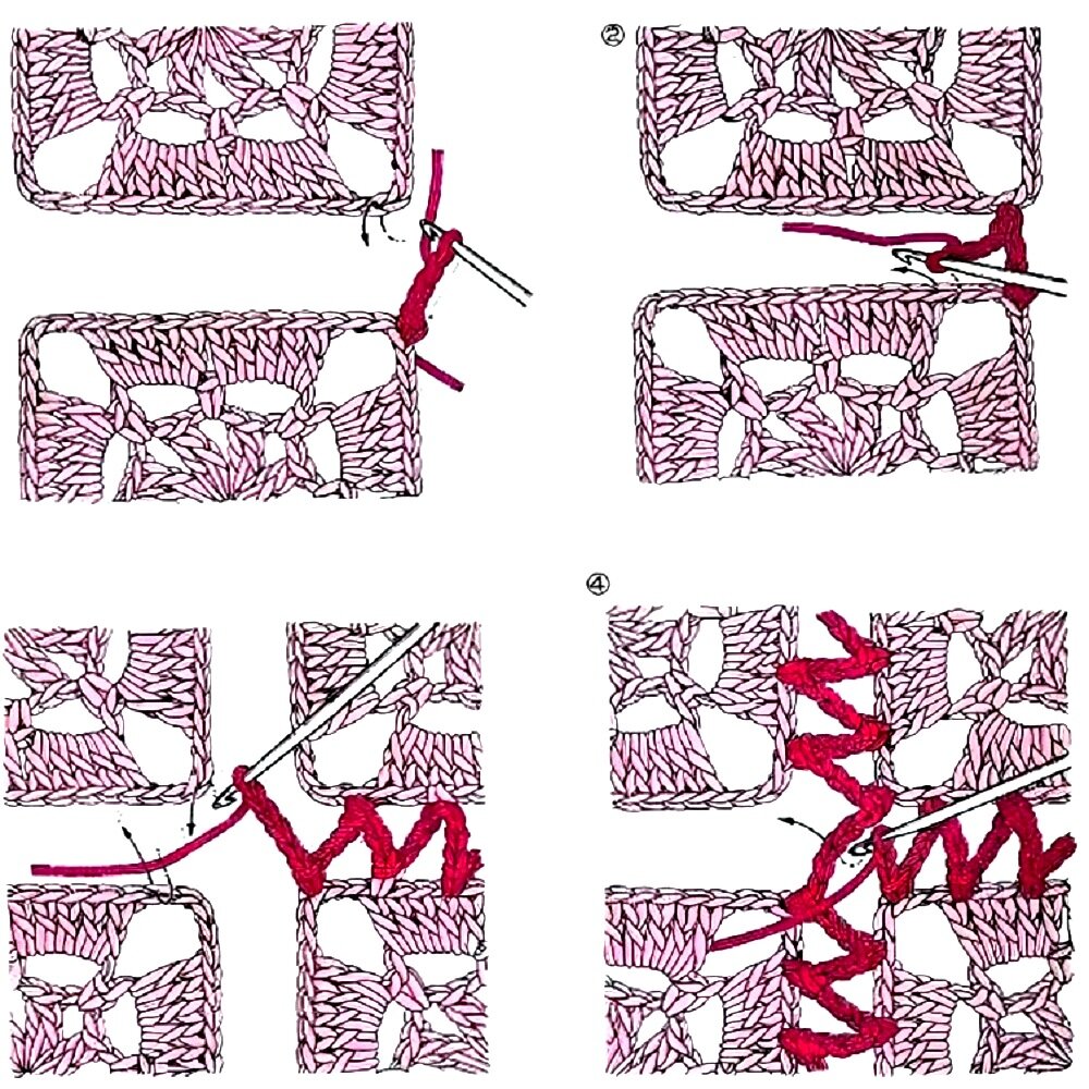 Теперь, когда с основным узором мы разобрались, пора приступать к вязанию. Соединять квадраты между собой можно как простой иглой, сшивая их, так и крючком — воздушными арками, тамбурным швом и так далее. Способов — огромное количество. Соединение может быть в тон квадратам, а может быть контрастным — на что хватит вашей фантазии.