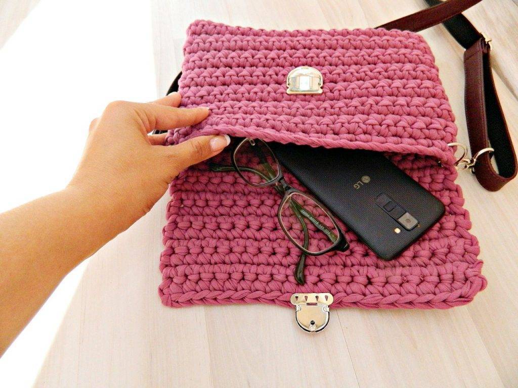 У неопытных мастериц при изготовлении трикотажной сумки могут возникнуть сложности — нитки немного растягиваются при использовании, что затрудняет вязание сумочки крючком. Да и к инструментам 7-9 размера нелегко приноровиться.