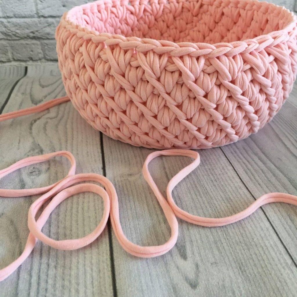 На самом деле подойдет разная пряжа, особенно хороши рафия и трикотажная, полиэфирный шнур, но можно и акрил и полушерсть взять, из которых мы вяжем пуловеры, плетут сумки и из полиэтиленовых пакетов.