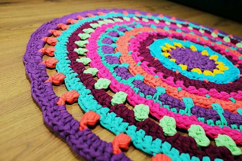 Собственноручно сделанный коврик позволит сэкономить немало денег на покупку аналогичного изделия. Кроме того, сам процесс вязания благотворно отражается на самочувствии – настроение улучшается, стресс и тревоги временно отступают на второй план.