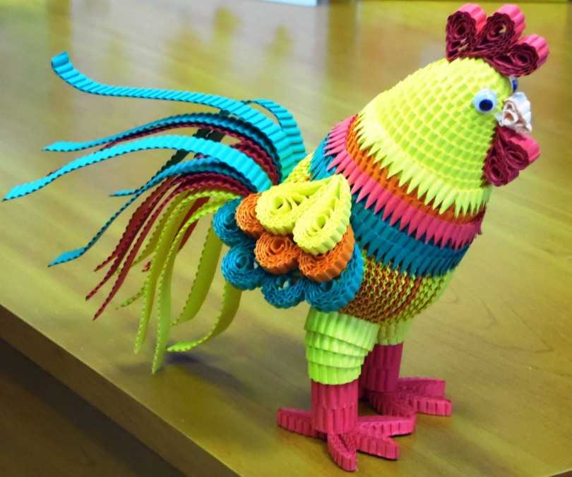 Такие яркие цыплята сделаны их трех простых модулей. Это отличная идея для тех, кто только учится скручивать элементы, но уже хочет создавать небольшие красивые поделки.