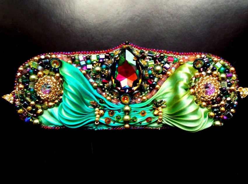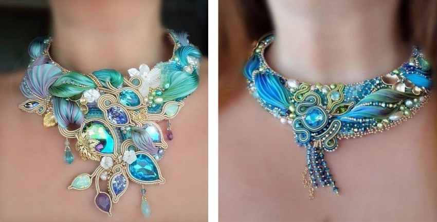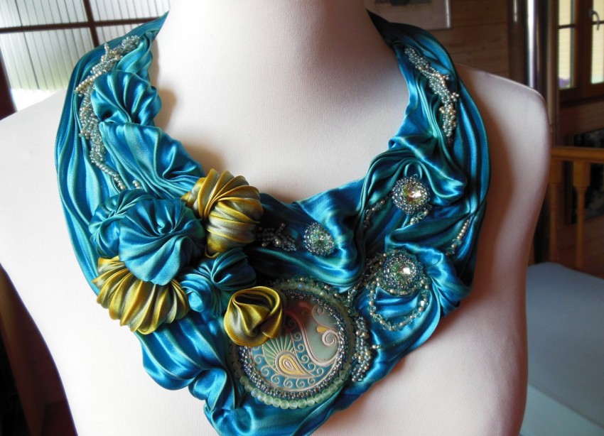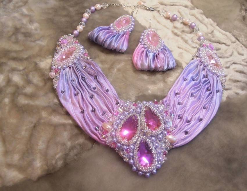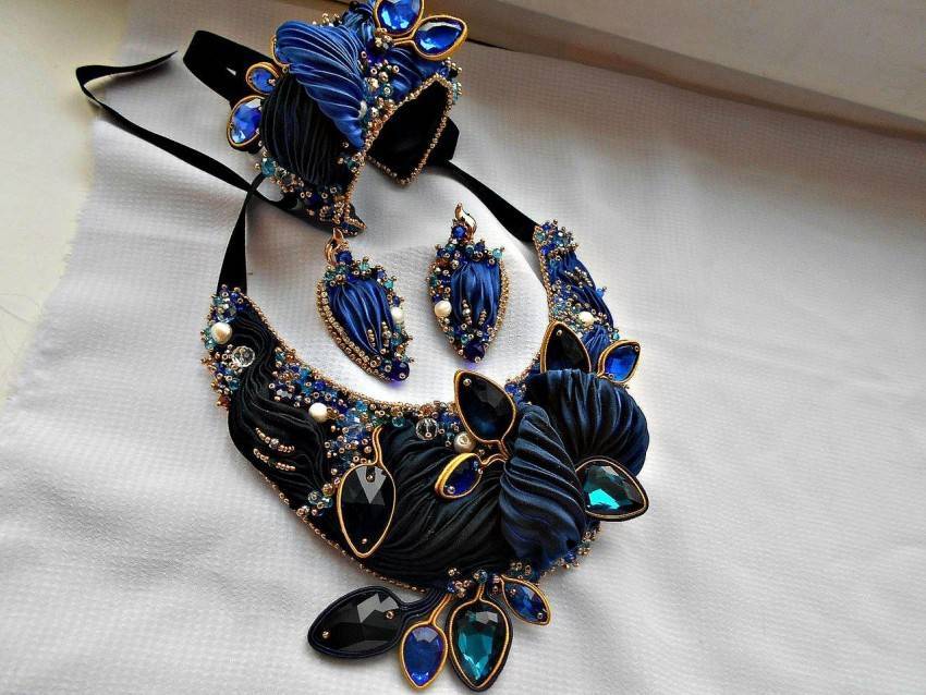Но сейчас многое изменилось, и с помощью техники шибори своими руками можно создавать шикарные украшения, в которых окрашенный в различные оттенки шелк и другие ткани расшиты бисером, стразами, ракушками, бусинами и даже полудрагоценными камнями.