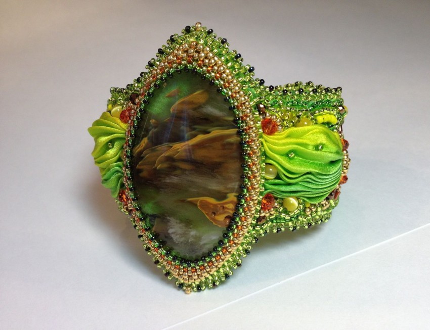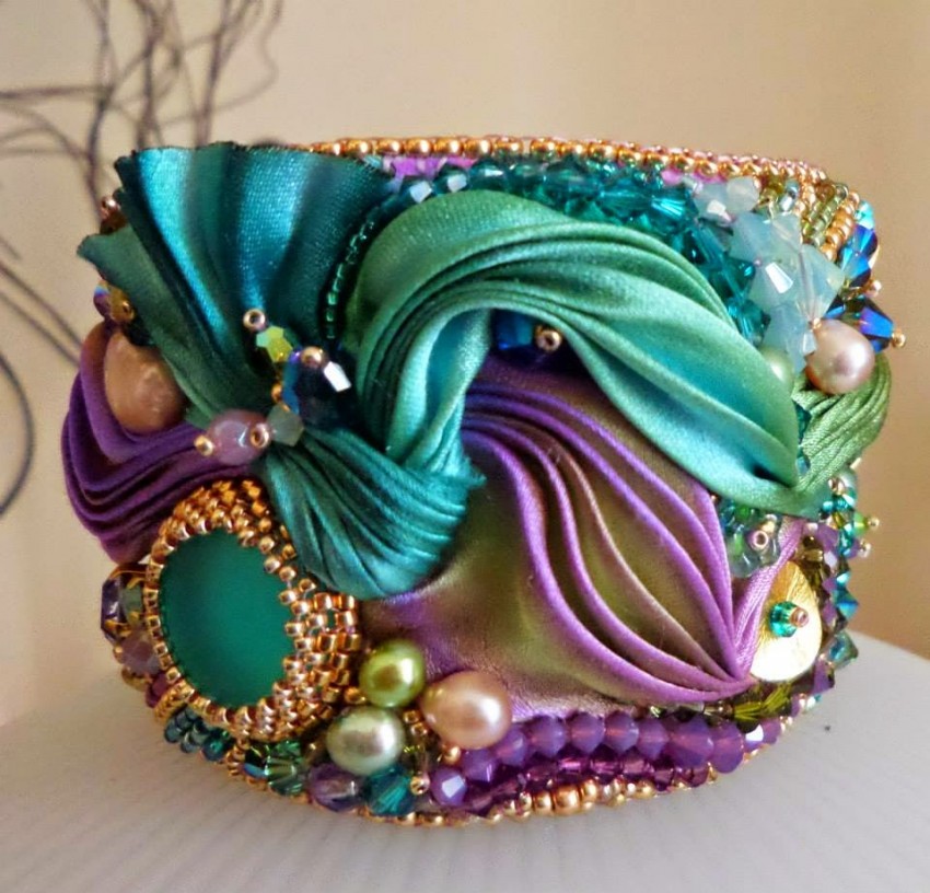 Техника шибори, украшения для начинающих мастериц в том числе, требует масштаба. Почему? Вся красота исходного материала – ленты будет видна, только если будет видно саму ленту, окрашенную сибори, загофрированную в мелкие складочки, окаймленную бисером и бусинами, дополненную сутажными дорожками и кабошонами. Поэтому данное рукоделие – украшение в технике шибори – достаточно масштабное по сравнению с ювелирным искусством, к примеру. Изготовление таких изделий позволяет развернуться фантазии, ведь лента сибори сама по себе уникальный материал, который просто требует, чтобы ему помогли раскрыть весь свой изумительный потенциал.