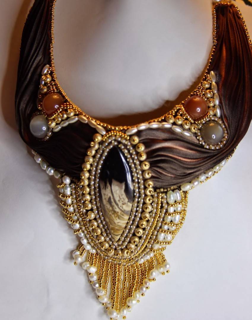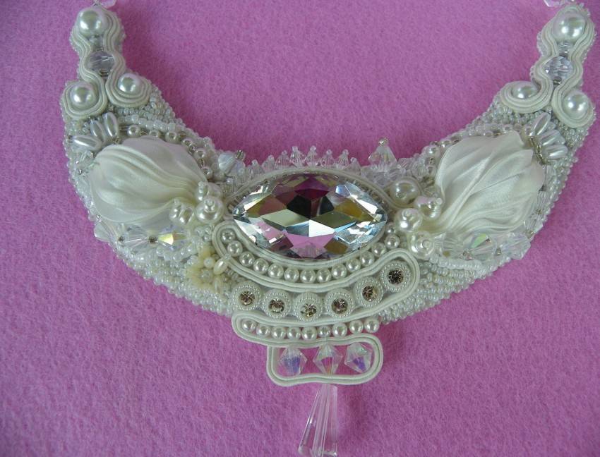 На этом этапе нужно решить, каким будет это украшение, чтобы зафиксировать на нем нужное крепление; в данном случае выбран вариант – колье и пришиты колечки с изнаночной стороны.