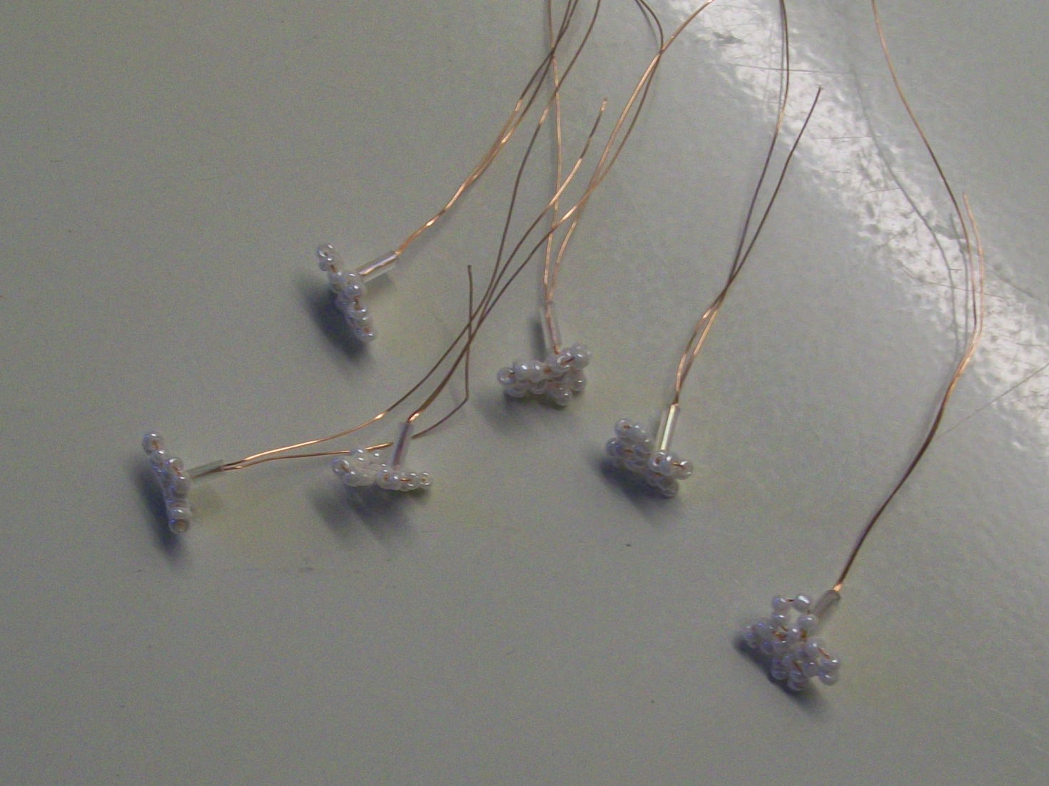 Изначально следует сделать миниатюрные ароматные соцветия этого чудесного цветущего куста. Для данной цели необходимо взять проволоку, длина которой равна 30 сантиметрам и набрать бусины общим количеством в пять штук. Все это должно находиться по центру от отрезка, подробно рассмотреть можно на фото.