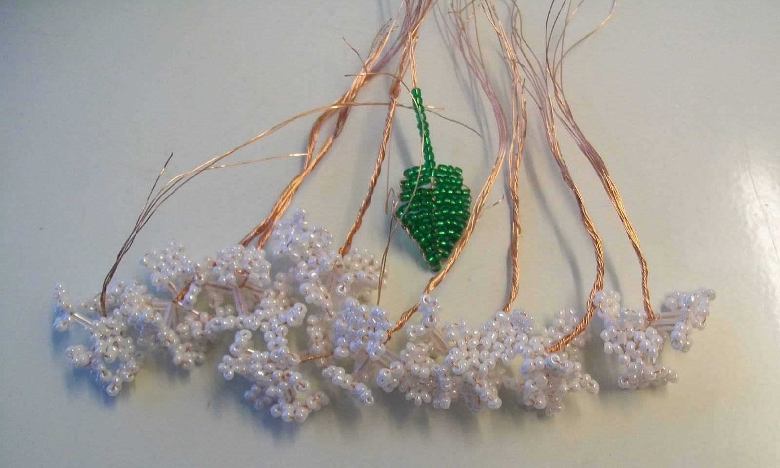 Цветочки представляют собой петельки из 7 бисеринок, нанизанных на проволоку и закреплённых там.
