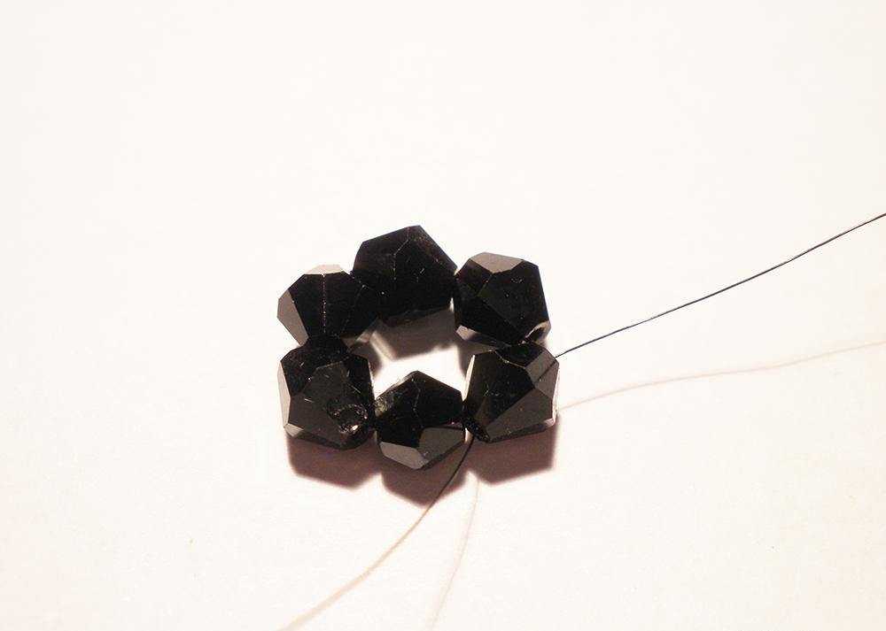Плетение начнем с того, что нанизываем шесть биконусов на леску и завяжем ее концы, формируем из них кольцо.