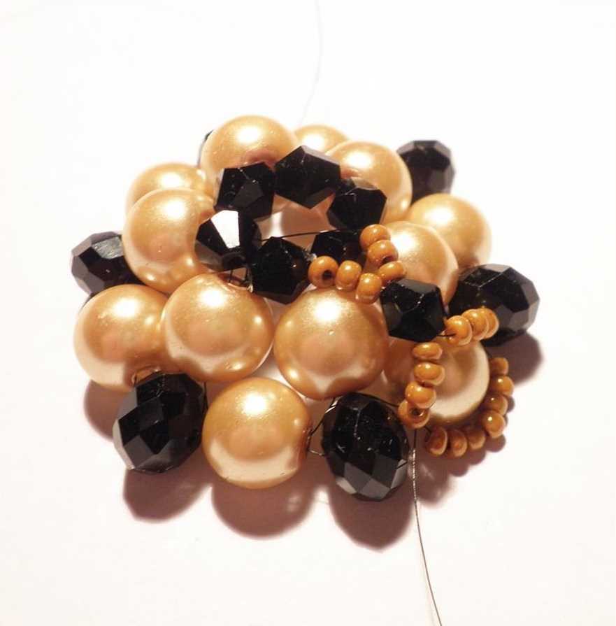 Остальные концы проволоки нужно пропустить через три-четыре крупных чёрных бусины, чтобы завершить нижнюю часть тельца. Можно перемежать бусины с бисеринами, имеющими большое отверстие, куда поместится шесть проволочек. Концы проволочек можно обжать фиксатором для бус или закрепить за последнюю бусину, обведя её и пропустив снова в её отверстие концы.