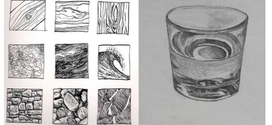 Вода, камень – более сложные текстуры. Надо показать неровные края камня, водную гладь и её глубину. Водную поверхность покажите штриховкой, кругами по воде, тенями. Неровную структуру камня подчеркните тенями, растушёвкой.