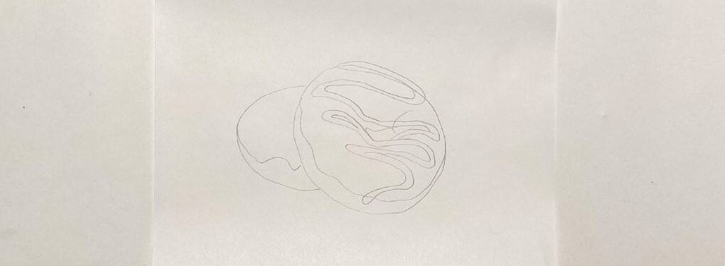 Далее на первом пончике по нижней стороне рисуем небольшую кривую линию, которая будет очерчивать глазурь. На втором пончике также рисуем небольшую кривую линию глазури. Линии глазури рисуем изогнутыми и полукруглыми.
