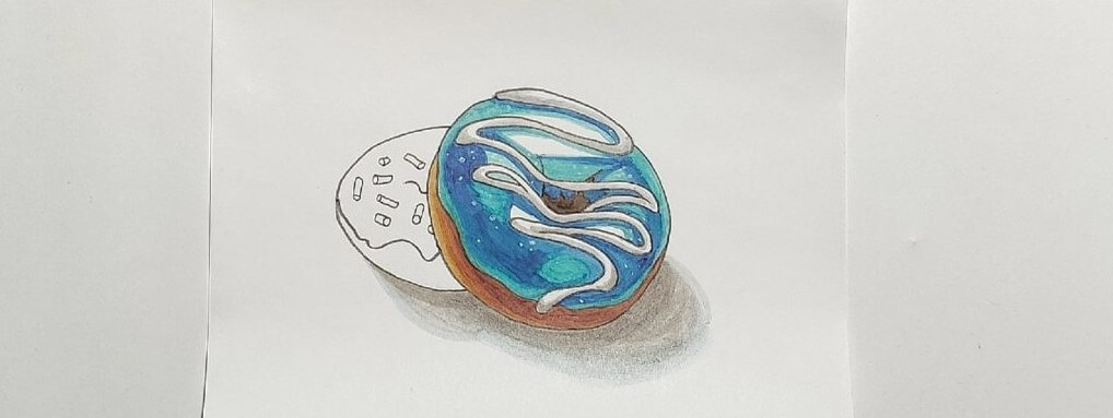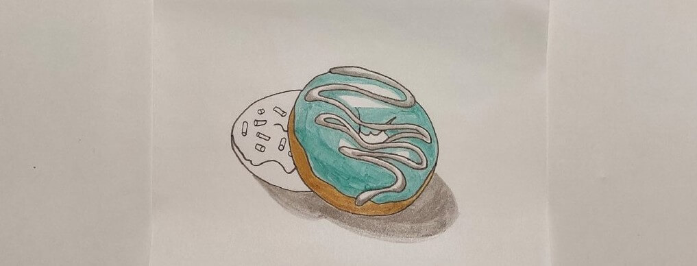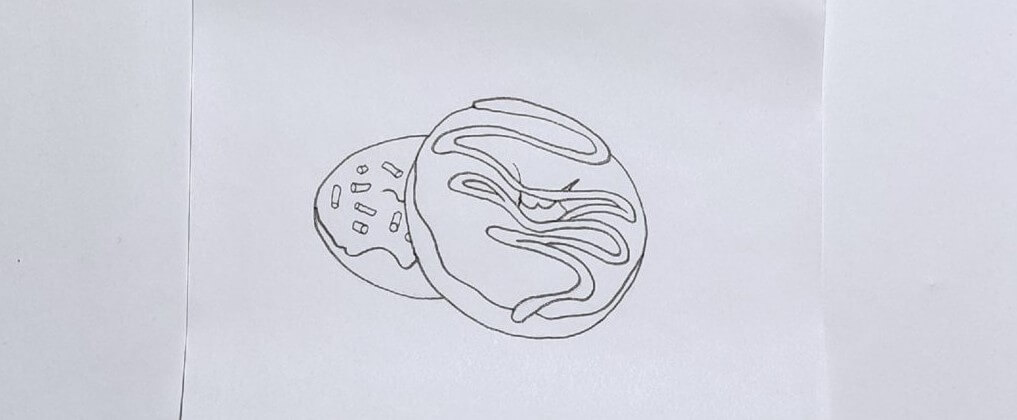 Берём линер и делаем обводку основных краёв. На втором пончике рисуем небольшую присыпку. После того как мы это нарисовали, необходимо подождать несколько минут чтобы высох линер. И далее стираем лишние линии карандаша, который нам не нужны.
