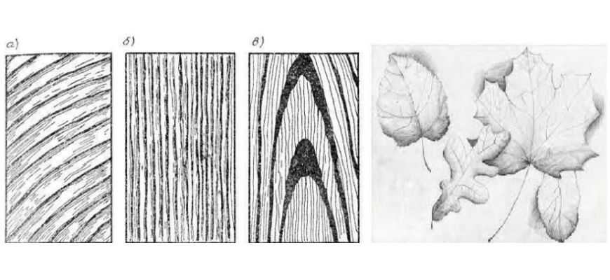 Листочки, дерево – пример простых фактур. Это непрямые линии, идущие от края листочка к центру или вертикально, как у дерева.