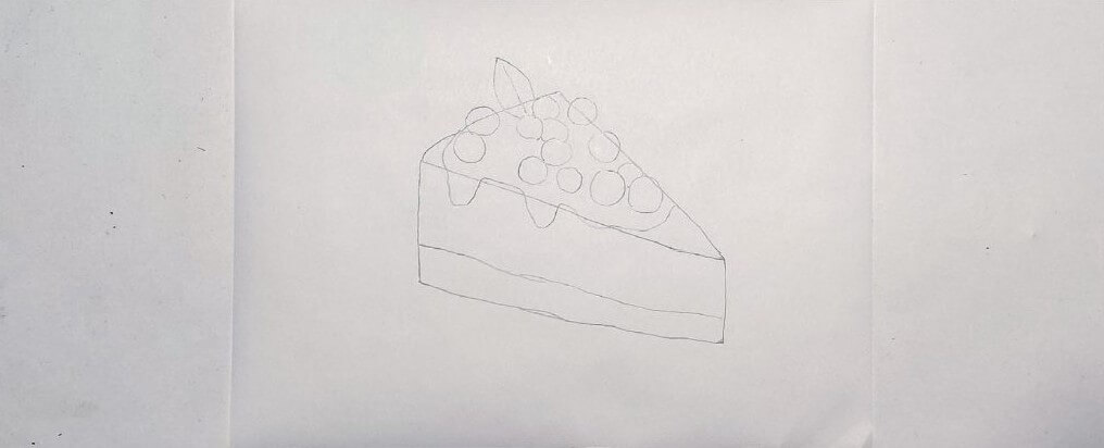 Сначала нарисуем пирог в верхней его части — рисуем треугольник, острой частью направленный немного под наклоном вправо. Далее от краев треугольника опускаем вниз вертикальные линии разной длины. Справа линия будет чуть-чуть короче левой. Снизу соединяем вертикальные линии и чуть-чуть выше рисуем ещё одну соединительную линию.