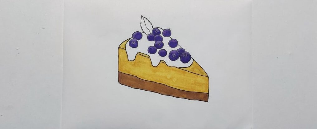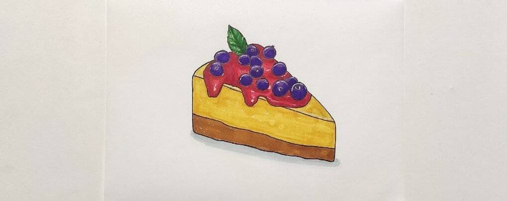 В конце белым линером добавляем блики на ягодах, глазури и листике. Дополнительно можно добавить блики на коржике, чтобы он выглядел более естественным. А под пирогом, светло-серым маркером добавляем падающую тень.