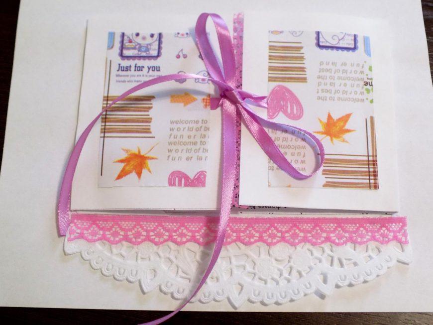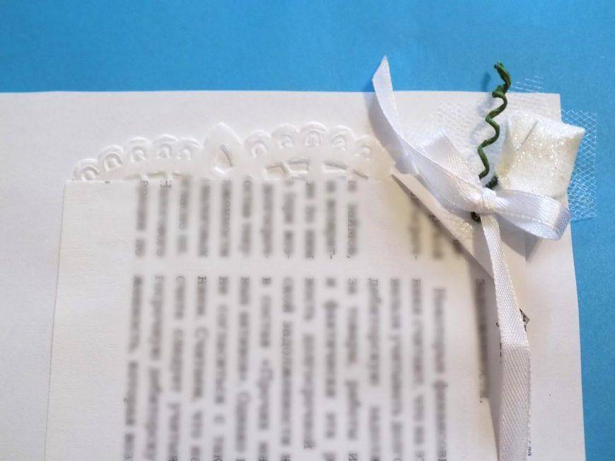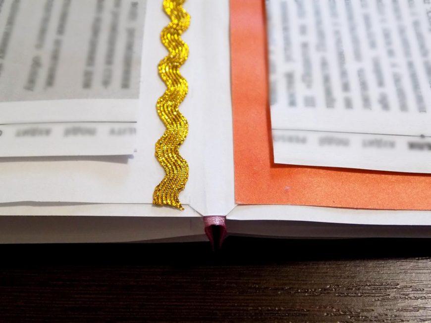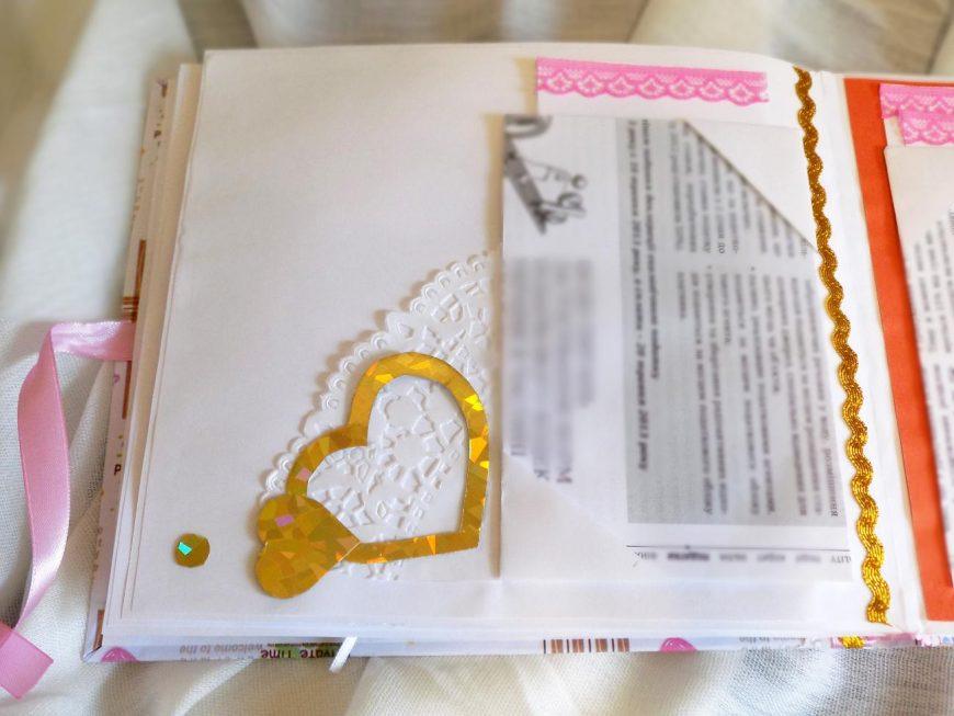 Для декора страниц отлично подойдет кружево. Чтобы не затрачивать много материала и получить стильный эффект, украсьте им только края страниц. Интересный вариант декора – несколько страз вдоль кружевной полоски и бантик на кончике.