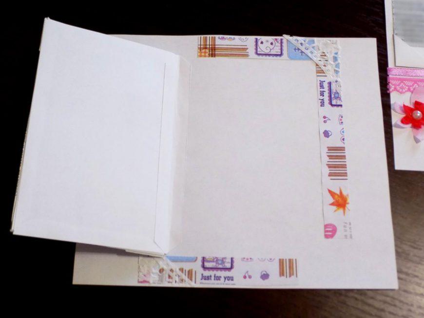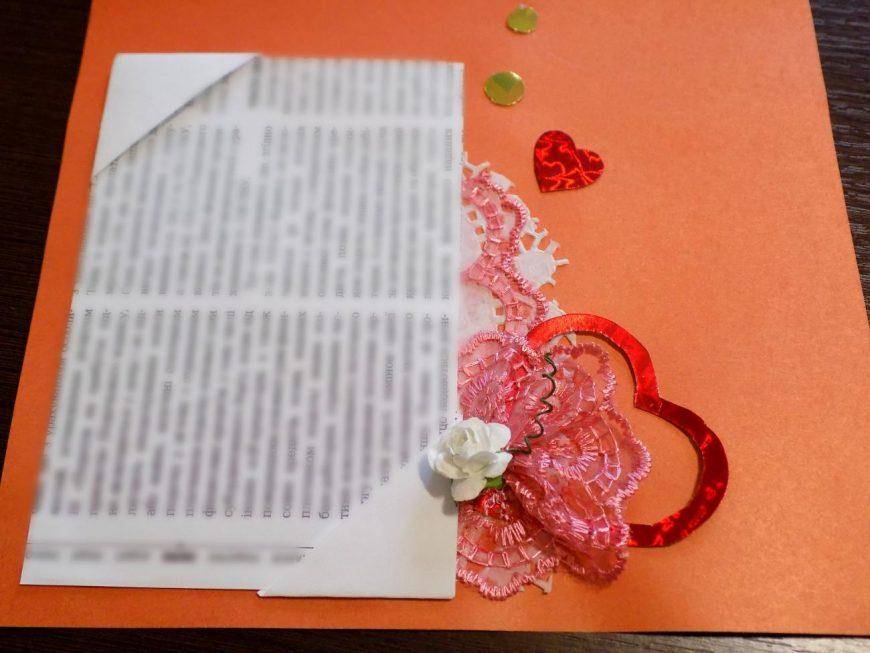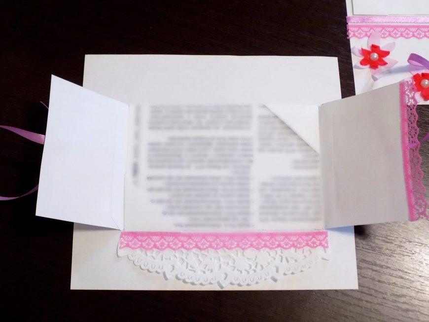 Следующий шаг – украшение обложки кружевом. Берем четыре кусочка широкой кружевной ленты и приклеиваем по краям обложки. Удачные цветовые решения для кружева – оттенки, которые будут контрастно смотреться с картоном.